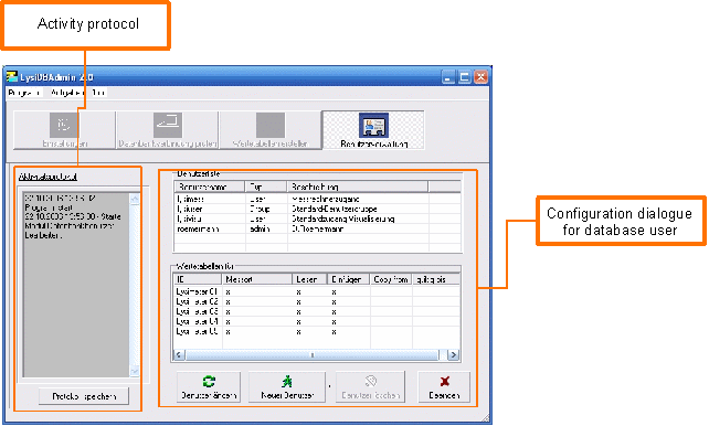 | LysiDBAdmin has several configurations dialogues  for itself to restrict the program user rights. Thus every program user  runs this program with his own database administration rights.